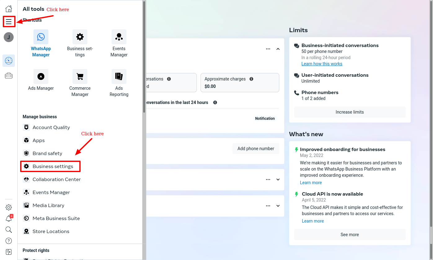 On the overview page, click on the menu button and the left sidebar will be expanded with all tools. Now click on the Business Settings.