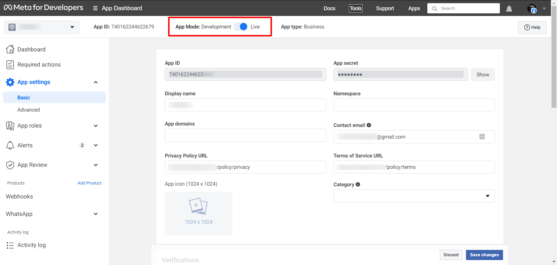 Then from the App settings, click on the Basic option and add the Privacy Policy URL and Terms of Service URL from the SuperXcreator. These URLs are available on the Connect bot page of SuperXcreator. After adding these URLs just click on the “Save changes” button.