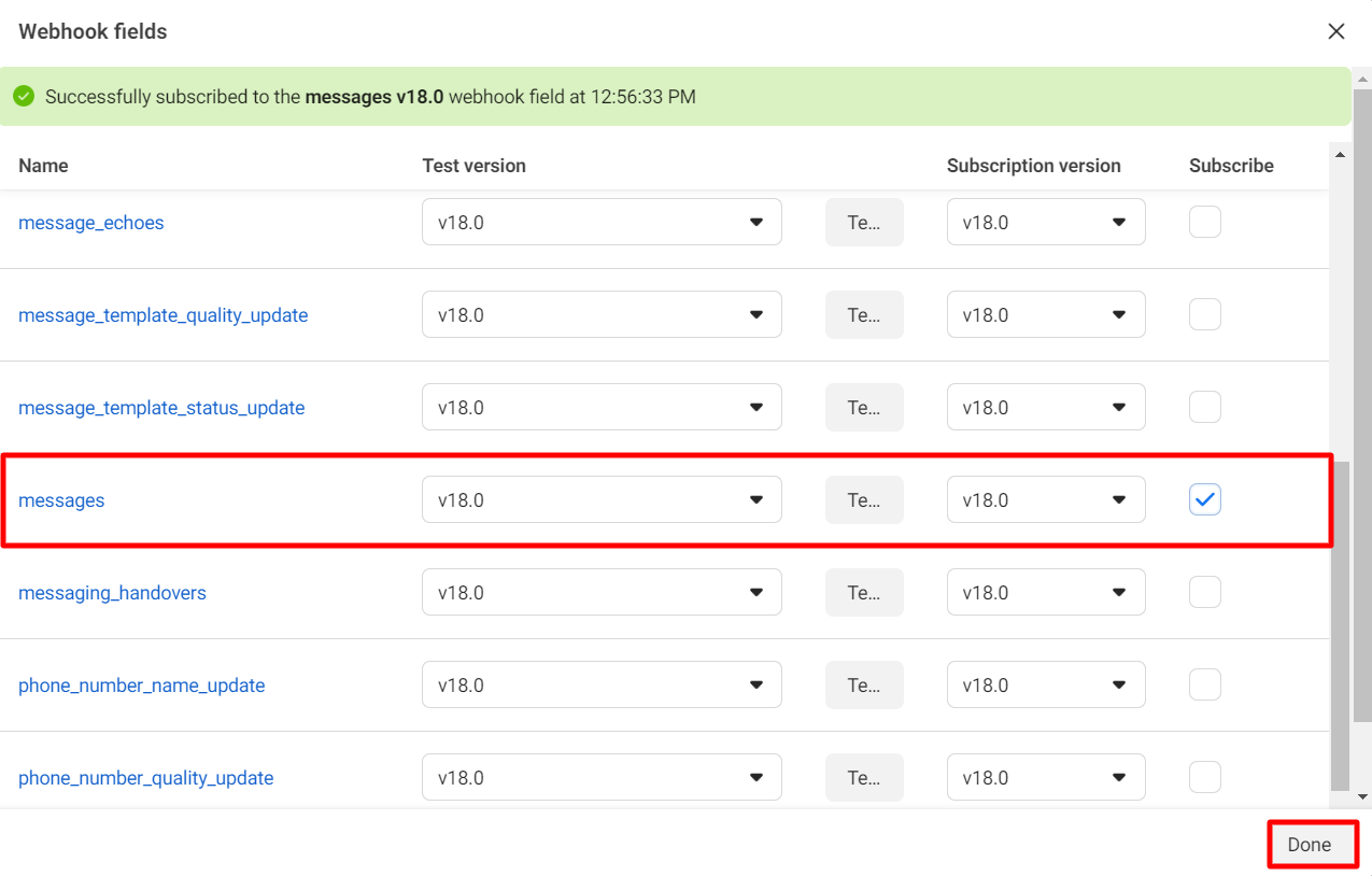 Instantly, a pop-up modal will appear with some webhook fields. Now subscribe Message webhook field. Now click on the Done button.